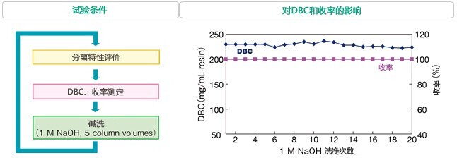 對于蛋白質(zhì)純化用色譜柱的清洗/殺菌常采用堿性溶液進行定位清洗的方法(CIP:cleaning in place)。YMC-BioProl離子交換填料因為具有卓越的耐堿性,所以即使使用1M NaOH實施20次的CIP也能維持高DBC和收率,而不會發(fā)生分離特性的改變。