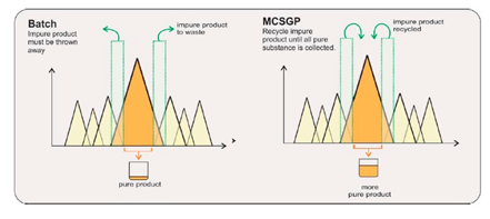 ????? MCSGP(Multicolumn Countercurrent Solvent Gradient Purification)用于精純環節,無需通過耗時的實驗設計(DoE)確定工藝條件,可有效克服典型SMB(模擬移動床)僅適用于二元分離、無法實現線性梯度的缺點。