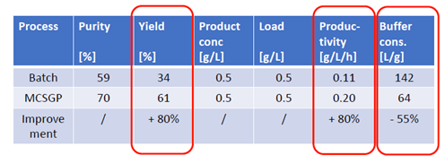 ??? 有案例證明,MCSGP可將產品純度從傳統工藝的59%提升至70%,將收率從傳統工藝的34%提升至61%,從而使產量(g /L /h)整體提升80%,并同時使Buffer的消耗量降低55%。MCSGP工藝,無疑可顯著地節約成本投入,并可產生更多的生產效益。