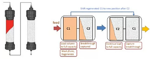 ? ? ? ?Capture SMB是將第一根層析柱的上樣流穿繼續(xù)上樣至第二根層析柱,待第一根層析柱完全滿載后,方結(jié)束其上樣,進(jìn)行淋洗、洗脫等操作,而此時第二根層析柱仍在繼續(xù)上樣。通過切換柱位操作,保證2根層析柱的洗脫、再生、上樣等操作交替銜接進(jìn)行,保證連續(xù)上樣,從而實現(xiàn)工藝與系統(tǒng)硬件設(shè)計的高度契合,使填料利用率最大化,用量大為縮減。