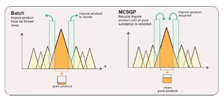 ? ? ? MCSGP工藝,可將含有不純組分的產(chǎn)品回收在一個封閉的環(huán)內(nèi),進(jìn)行循環(huán)式的層析操作,從而最大限度地提取純產(chǎn)品,使得收率和純度二者兼得。
