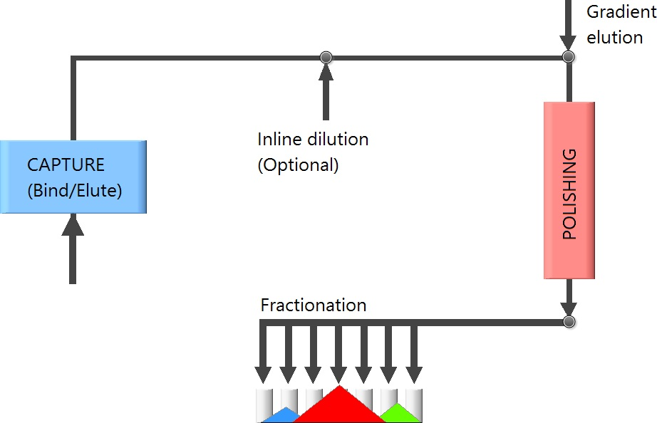 所有的Contichrom系統(tǒng)可以將兩個(gè)層析步驟(例如捕獲和精純)整合為一個(gè)單一的過程,第一步層析洗脫的產(chǎn)物可以直接被稀釋,從而直接進(jìn)行第二步層析,因此省略了中間的間歇過程,這是非常適用于高生產(chǎn)量純化的。
