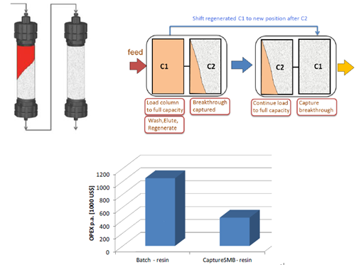 傳統(tǒng)層析工藝,由于流穿效應(yīng),有30-50%的填料是無法被完全利用的,從而使得載量和處理量大為受限。Capture SMB用于優(yōu)化捕獲環(huán)節(jié),作為最簡單和最強(qiáng)大的2柱位設(shè)計(jì),可使純化效率顯著提高,并且使填料用量大為縮減。