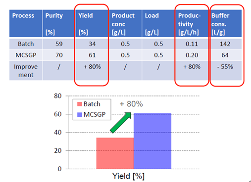 有案例證明,MCSGP可將產(chǎn)品純度從傳統(tǒng)工藝的59%提升至70%,將收率從傳統(tǒng)工藝的34%提升至61%,從而使產(chǎn)量(g /L /h)整體提升80%,并同時(shí)使Buffer的消耗量降低55%。MCSGP工藝,無疑可顯著地節(jié)約成本投入,并可產(chǎn)生更多的生產(chǎn)效益。