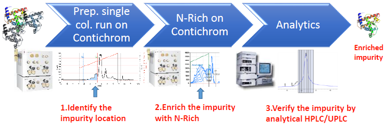 N-Rich工藝是微量物質(zhì)的富集過程,比如將產(chǎn)品的相關(guān)雜質(zhì)選擇性地富集在一個(gè)循環(huán)的層析過程中,待富集至目標(biāo)量,再進(jìn)行洗脫回收。該方法特別適用于分離與產(chǎn)品有關(guān)的雜質(zhì),如異構(gòu)體和聚集體,并同時(shí)用于發(fā)現(xiàn)研究。