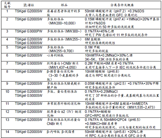 表1所示為TSKgel色譜柱在采用GFC法進行多肽分離的相關文獻及其概要。