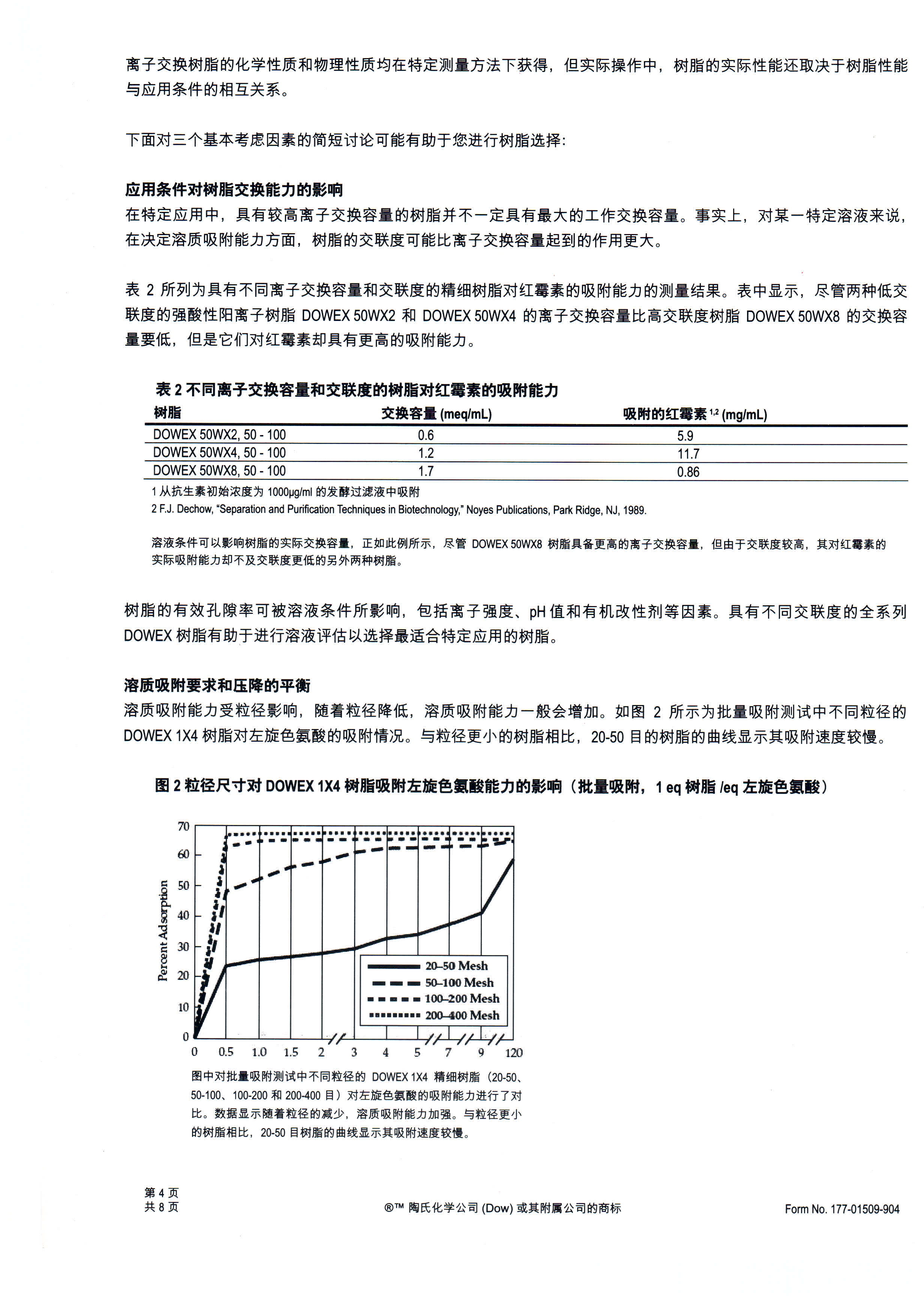 ?????? DOWEX系列離子交換色譜分離樹脂有強酸性陽離子交換樹脂和強堿性陰離子交換樹脂兩大類,每一類又根據(jù)交聯(lián)度(即DVB%)的不同劃分為3個小類,分別以“×2”、 “×4”與“×8”表示,在此基礎(chǔ)上進一步提供3個粒度范圍可供選擇,即150-300μm(50-100目)、75-150μm(100-200目)以及35-75μm(200-400目),共計18個樹脂牌號。顯然,不同交聯(lián)度的樹脂含水量不一,體積交換量、物質(zhì)擴散的阻力各異,如此寬泛的產(chǎn)品范圍豐富了客戶的試用選擇,可以針對具體的應(yīng)用優(yōu)選出適宜的色譜分離樹脂。