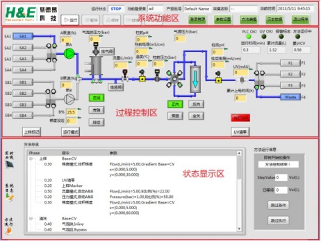 QuikSep Prep全自動層析系統(tǒng)軟件符合新版GMP規(guī)范,采用圖形化界面、全自動操作,簡明扼要,任何操作及狀態(tài)均可實時顯示在主界面狀態(tài)欄中,自動化程度高。結合了大量的容錯性設計,貼合生產(chǎn)實際,降低了對操作人員的技能要求。參考圖: