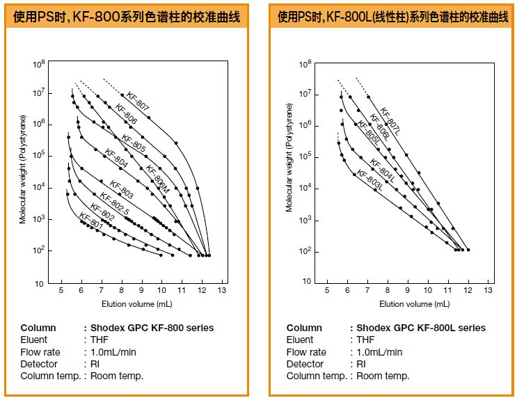 GPC KF-803是標準的油溶性SEC色譜柱,適用于從低分子量到高分子量的寬范圍的樣品。流動相是THF。