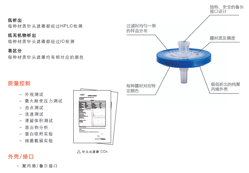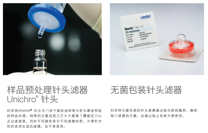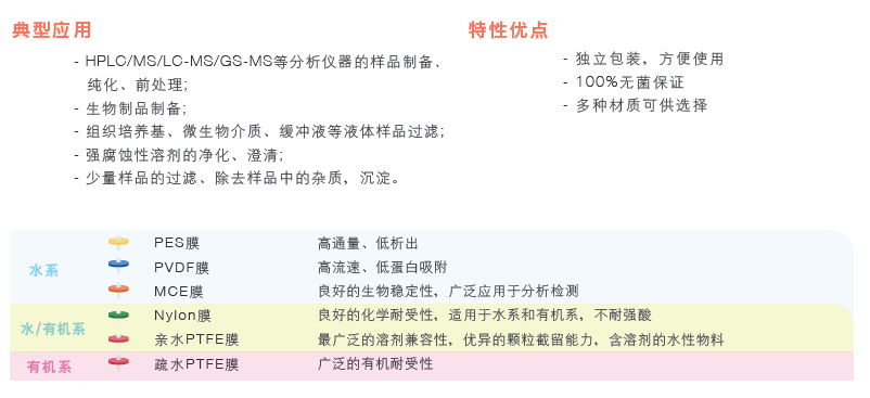 科百特針式過濾器采用PES/PCDF/Nylon/親水PTFE/GF等濾材,以過濾不同性質(zhì)的物料,設(shè)計采用超聲波焊接技術(shù),減少使用時從側(cè)面漏液的風(fēng)險,同時每個針頭根據(jù)膜材質(zhì)的不同而采用不同顏色標(biāo)注,為您提供高效、快速的過濾選擇!